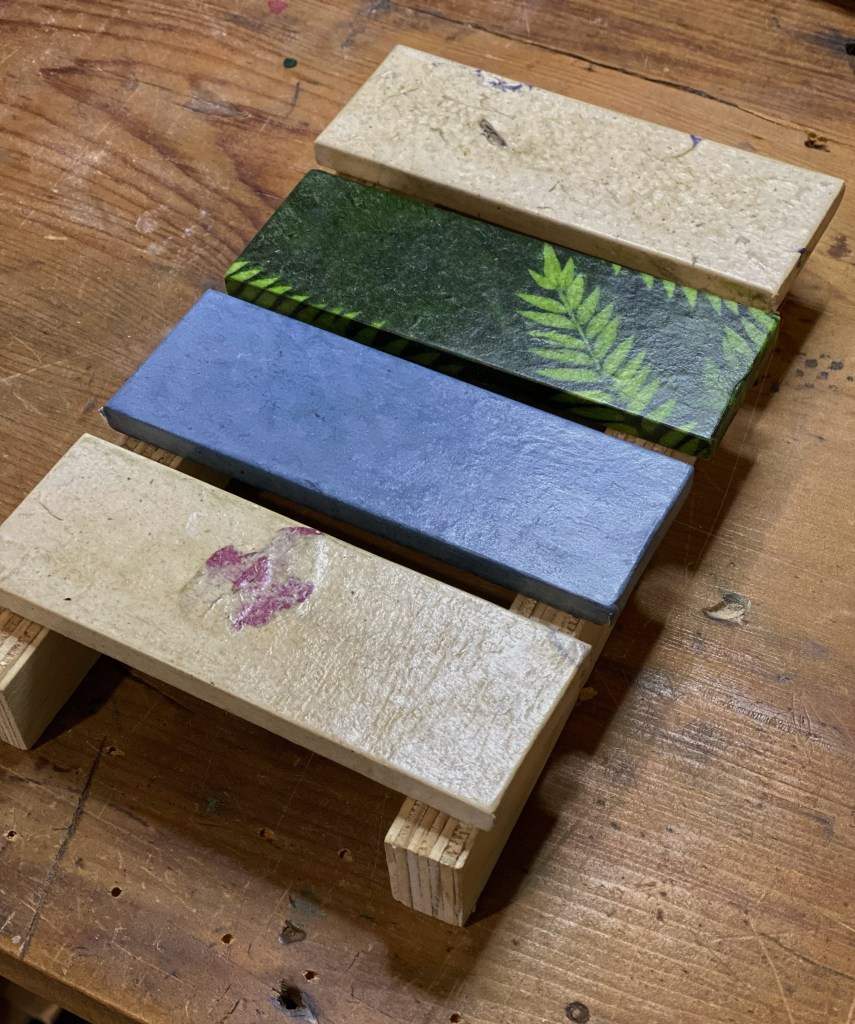 I knew that I needed to to some tests to check how well the wax would work so I backed some samples of lokta paper on to 125 gsm acid free cartridge paper using an archival flexible PVA adhesive then when dry, mounted the samples to pre sanded 9mm plywood blocks.