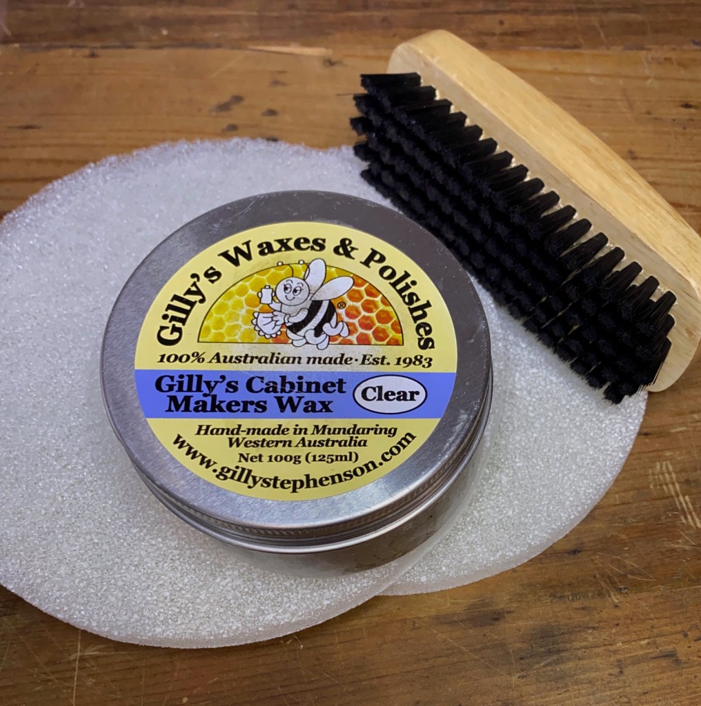 The waxing kit contains a can of the Gilly Stephensons Cabinet Makers Wax as well as 2 150mm polishing pads and a buffing brush