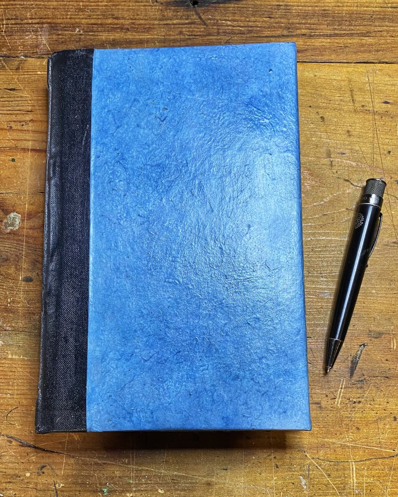 The book in the photo shown above is a A5 tape bound hand sewn journal. It features a waxed indigo blue lokta paper cover.