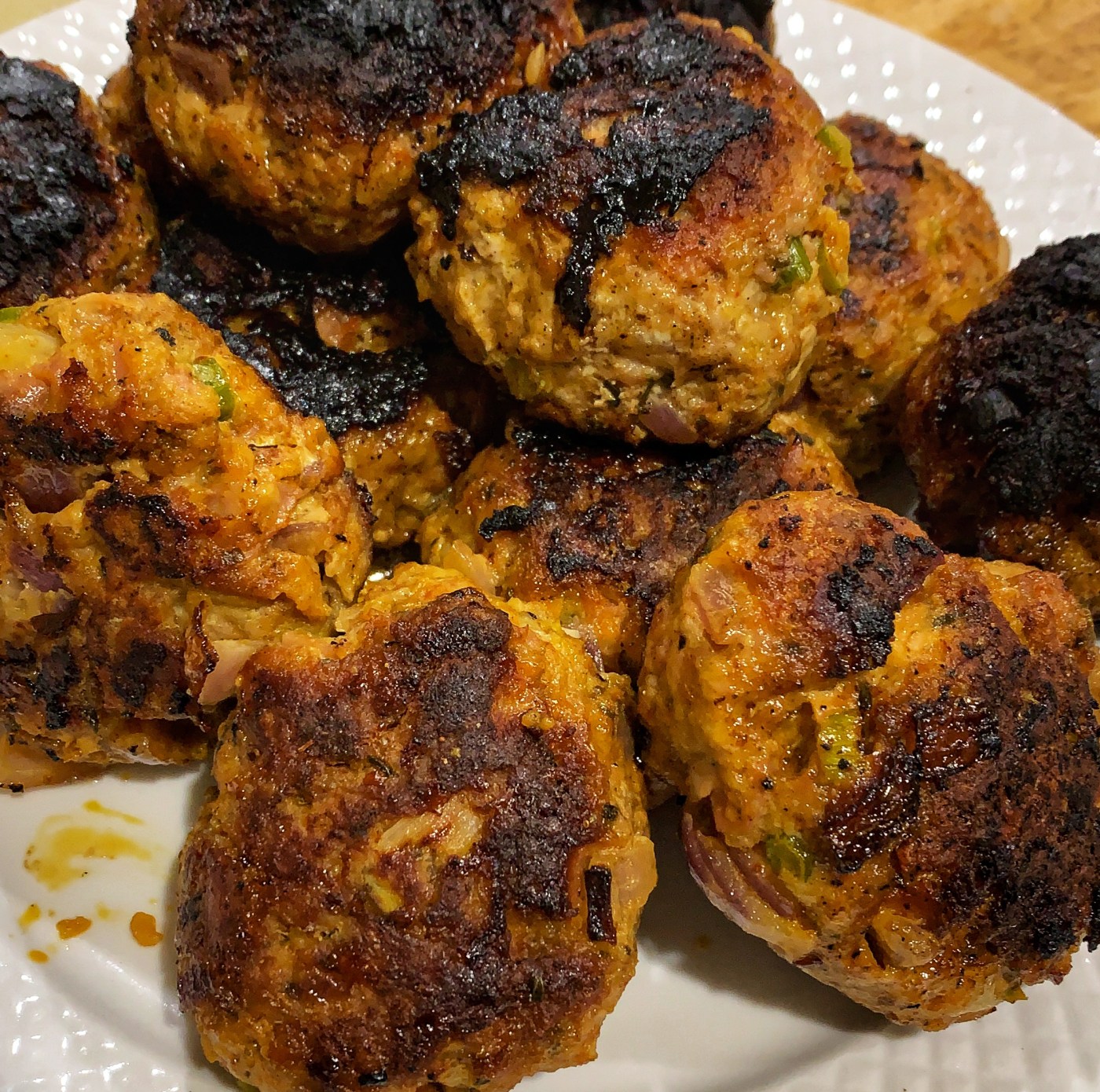- Divide the mix and roll into 12-14 balls, then flatten slightly and place on a plate. Cover with kitchen wrap and place in the freezer for 10 – 15 minutes to allow then to firm up which helps them keep their shape while cooking