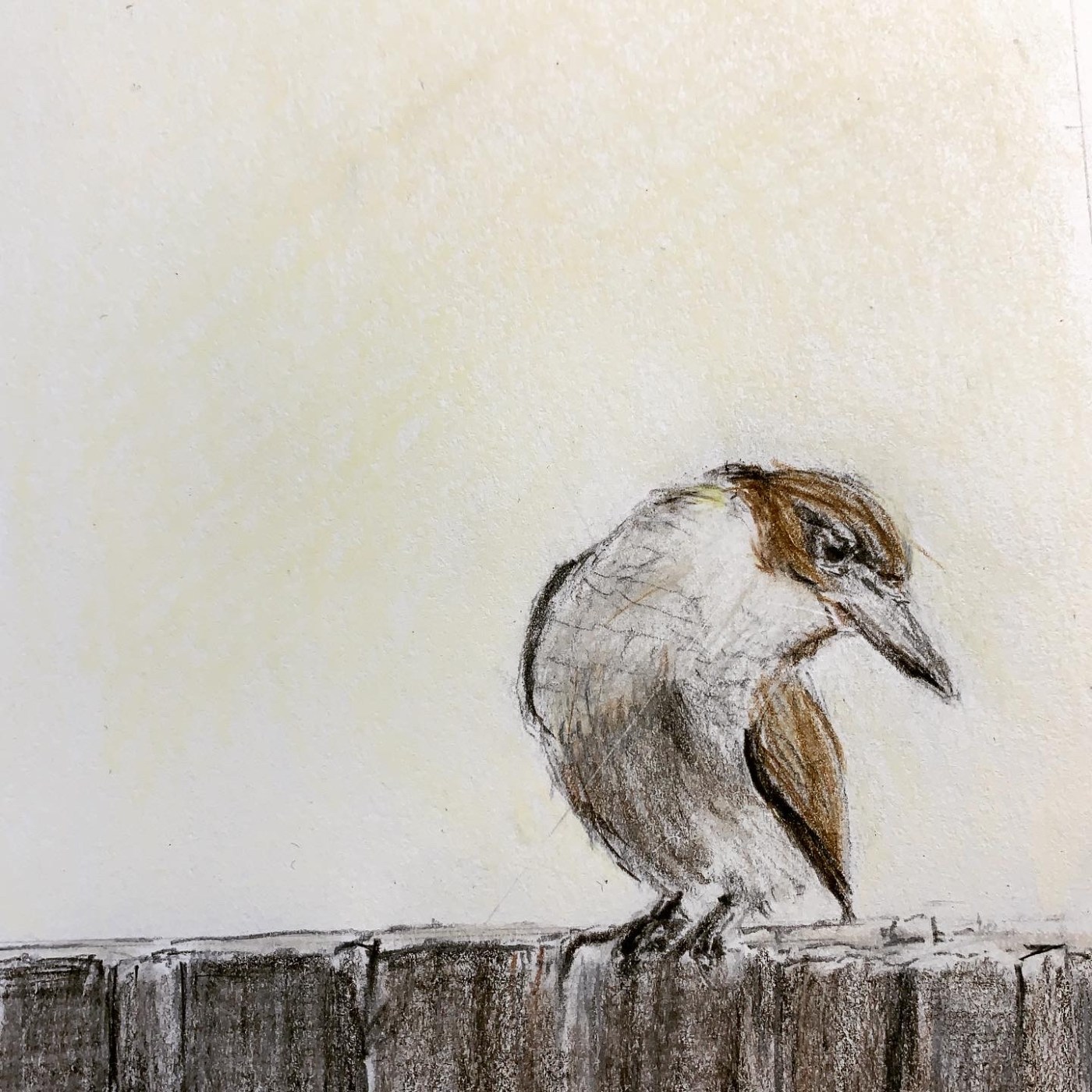We had a young Grey Butcherbird come and visit us yesterday while we were gardening. I snapped a couple of shots on my phone and spent a few hours this morning working up a rough coloured pencil sketch.