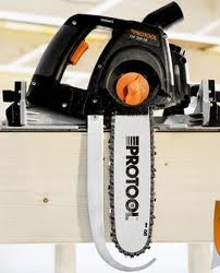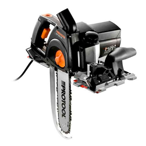 The SSP is in essence, a chain saw that’s mounted onto a circular saw base. It has a maximum cutting depth of 200mm (about 8 inches) and it runs along standard Festool or Protool, guide rails for accuracy and ease of cut.