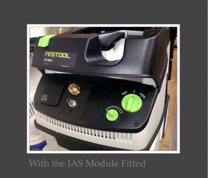 The IAS, (integrated air supply) module is part of Festool’s pneumatic sanding system and allows you to hook up a air operated sander to your CT 26 or 36 extractor for tool actuated pneumatic sanding. Once the module is installed you can decide on wether you go the hole hog and use the Festool IAS adapters and hoses which connect to the LEX range of Festool Pneumatic sanders or simply connect an airline to the port on the extractor and use the the standard CT hose to connect to your non Festool air sander.