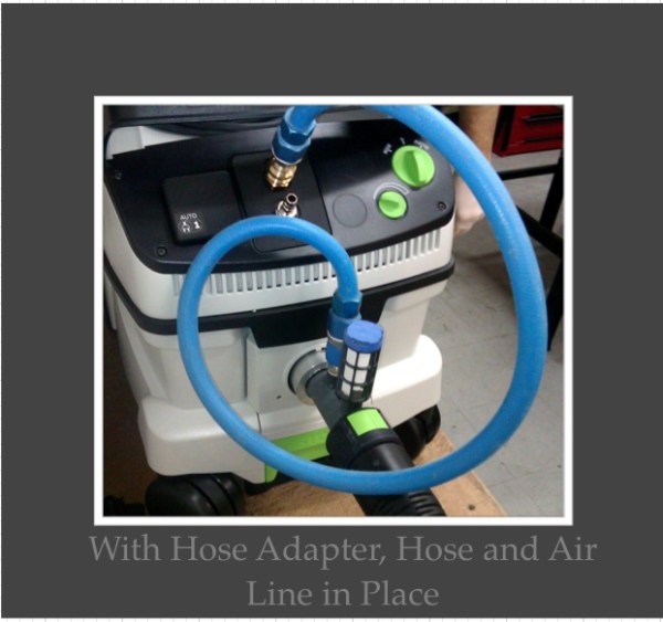The beauty of the Festool system lies in the IAS hose. It is a complete unit which incorporates a central air line in which is surrounded by another hose which removes the excess air. Both of these hoses are encased in a 36mm antistatic hose which removes the sanding dust from the sander.